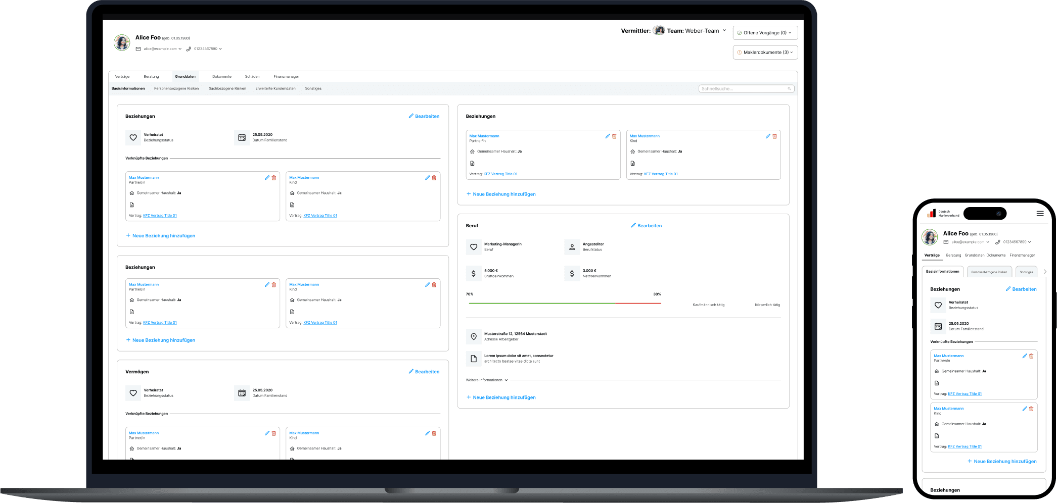 Beim Deutschen Maklerverbund war ich maßgeblich an der UX-Überarbeitung der Kundenakte beteiligt. In enger Zusammenarbeit mit anderen UX-Designern und Product Ownern konnte ich wertvolle Erfahrungen in den Bereichen UX-Methoden, Design Thinking und Design Sprints sammeln und praktisch anwenden.